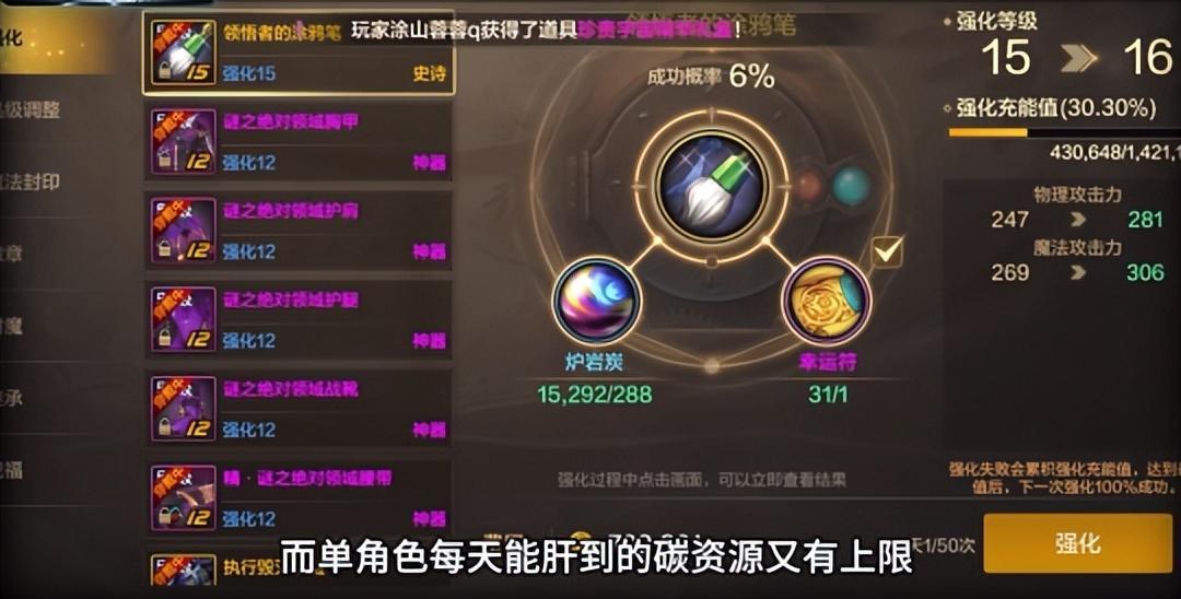而單角色每天能肝到的碳資源又有上限,所以多肝幾個角色,然後用小號搬磚來養大號,就成了DNF手遊最基本的玩法。