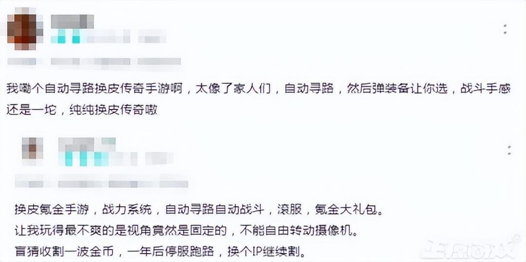 有網友吐槽,這就是換皮的傳奇手遊,自動尋路,彈出裝備讓你選,戰鬥沒手感。還有網友吐槽,換皮氪金手遊,戰力系統,自動尋路自動戰鬥,滾服,氪金大禮包。盲猜收割一波金幣,一年後停服跑路,換個IP繼續割。
