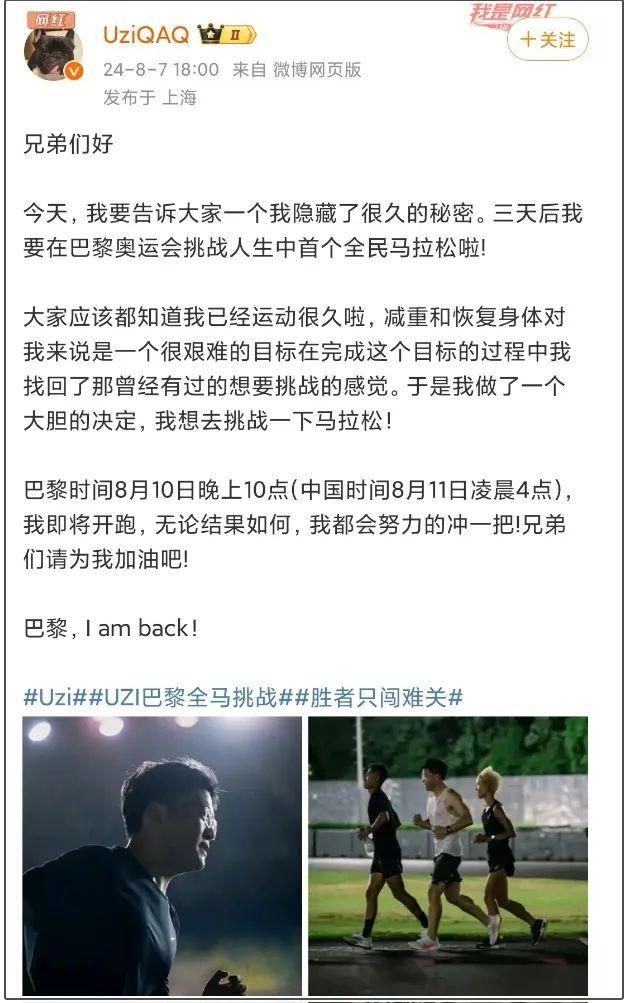 Uzi更新微博說,自己將參加巴黎奧運會的馬拉松項目,在北京時間8月11日凌晨4點比賽。