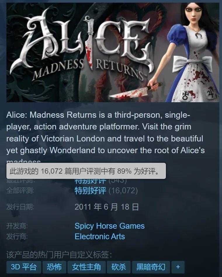 《愛麗絲:瘋狂迴歸》現在在Steam上只賣不到9塊錢。這是美國製作人和中國開發組麻辣馬過去做的哥特風遊戲,是許多人心中難以替代的佳作。