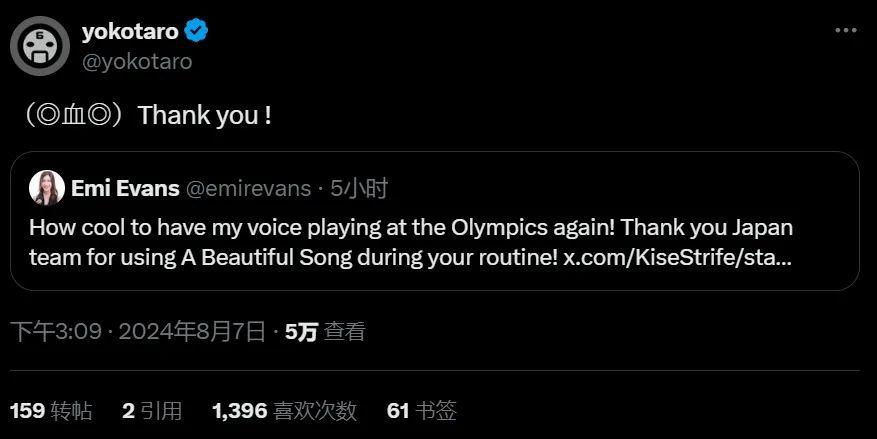 日本隊在巴黎奧運會的花樣游泳比賽中,選擇了《尼爾:機械紀元》中的《美麗之歌》作爲參賽曲目。