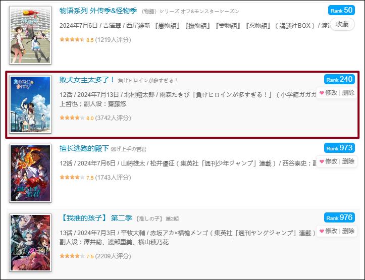 《敗犬女主》在第4集更新之後,達到僅次於《物語外傳》的8.0分,遠超了同季其他新作。