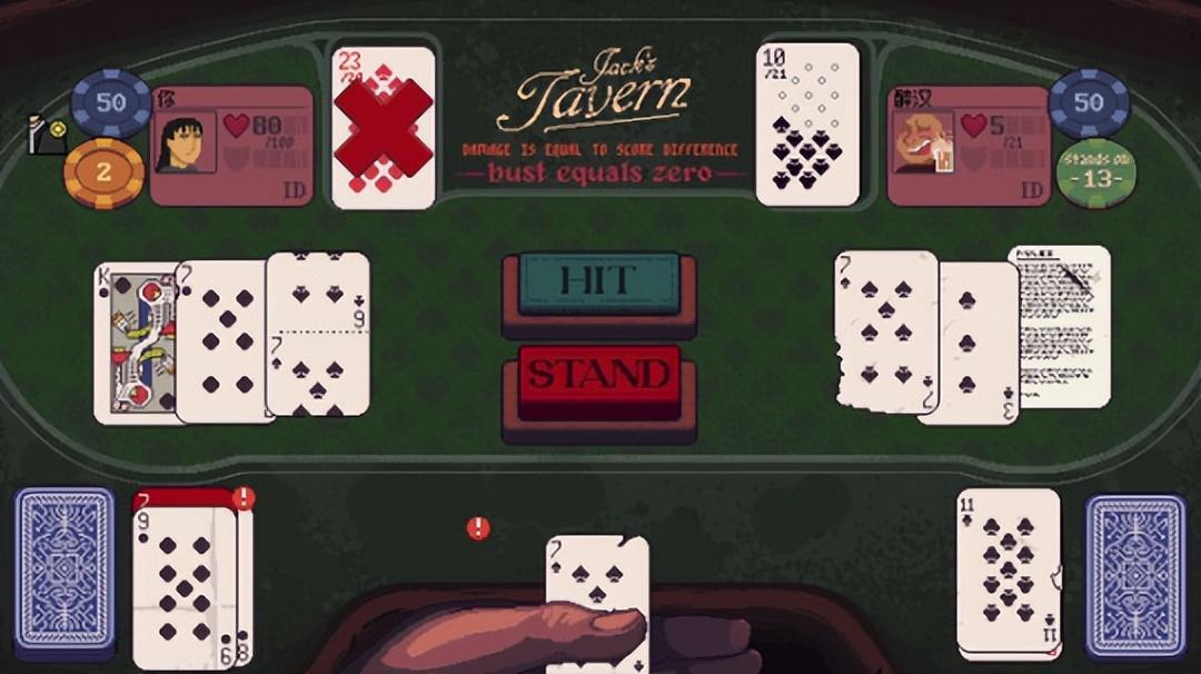 這款遊戲以撲克牌“21點”玩法爲基礎,玩家需精準計算手中的點數,既要追求接近21點的極限,又要時刻提防爆牌的危機。而當對手不慎步入雷區,你便有機會以手中的優勢,直接削減其生命值,體驗逆轉乾坤的快感。遊戲中總計有超過200張卡牌,不僅每種花色對應不同的能力,還有功能獨特的塔羅牌、道具牌、節日牌等。此外,遊戲中還穿插着各種隨機事件,它們如同酒館中的奇遇,爲玩家的冒險之旅增添了一抹不可預測的色彩。這些事件或助力你構建更強的牌組,或考驗你的應變能力,讓每一局遊戲都成爲獨一無二的體驗。