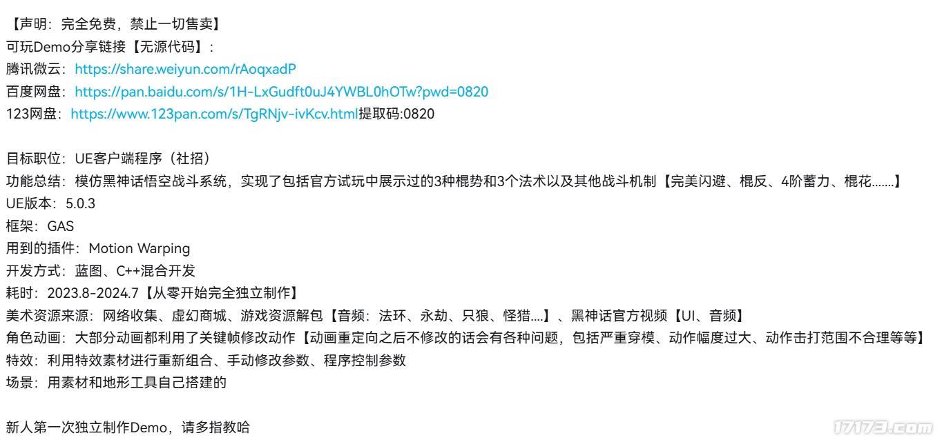 作者坦言,在製作這個戰鬥系統時,參考了很多視頻資料,包括線下試玩的UP主們的分析和錄屏,以及官方的實機演示。雖然無法完全復刻《黑神話》的戰鬥系統,但他至少希望能做到一些表層的相似,這樣玩家們在遊戲上線後能更快上手。