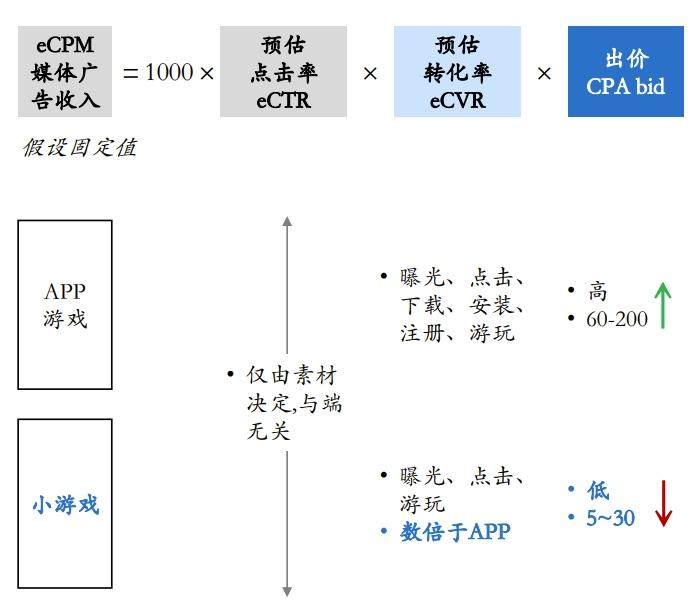 考慮公式【媒體收入(ecpm)=1000*點擊率(ctr)*轉化率(cvr)*出價(bid)】,由於同樣的內容/素材會固定點擊率,而小遊戲一鍵拉起的轉化鏈路天然比app手遊短太多(以及微信的復訪鏈路也很短),轉化率高出幾倍甚至十幾倍,則同樣的ECPM下,小遊戲的出價僅爲手遊的幾分之一,十幾分之一。