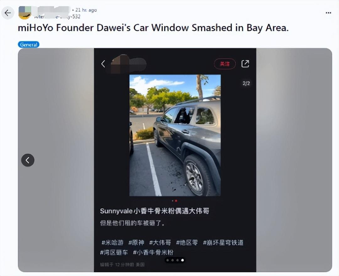 近日,國內社交媒體上有用戶分享了自己與米哈遊創始人大偉哥在美國灣區的合影,並透露大偉哥租的車被人砸了。此事引發國外網友熱議。