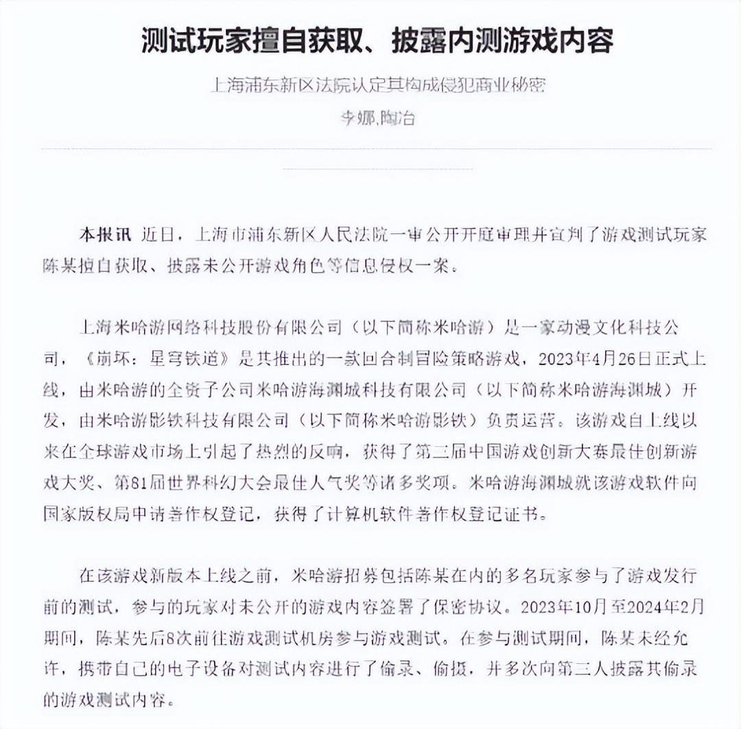 近日上海市浦東新區人民法院公開開庭審理了《崩壞:星穹鐵道》測試玩家陳某「擅自獲取、披露未公開遊戲角色等信息侵權」一案,認定其構成侵犯商業祕密,判決賠償50萬元,被告表示接受判決不上訴。