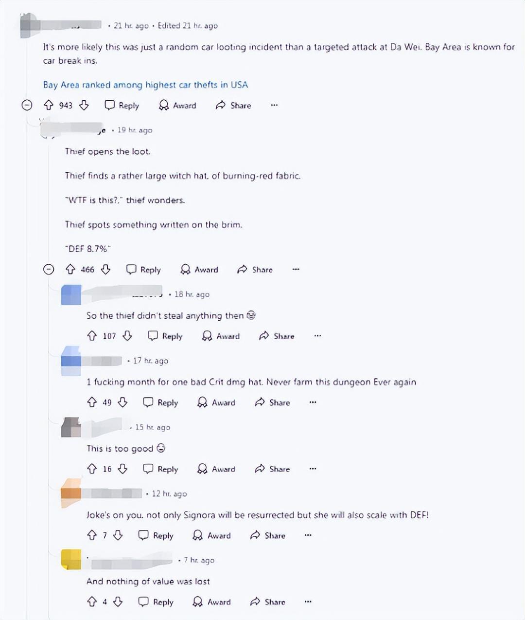 不過,得知此事的海外玩家還是玩起了《原神》的梗,“小偷打開了贓物,發現了一頂相當大的巫師帽,上面寫着‘防禦+8.7%’。”