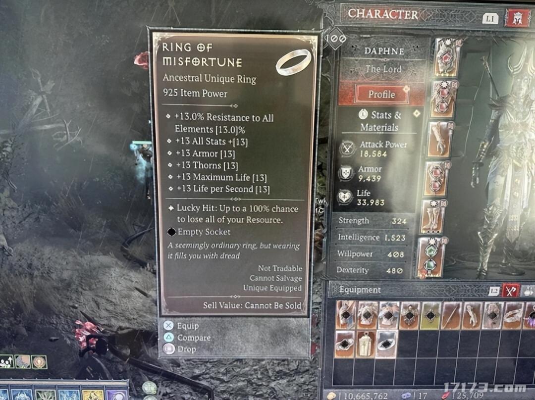 根據“不幸之戒”的描述,它看起來是“一枚看似普通的戒指”,它爲裝備者提供了 +13 的所有主屬性,+13 的護甲、荊棘傷害、最大生命值和每秒生命恢復,以及 +13% 所有元素抗性。這些都是很弱的屬性提升,但它的特效纔是被稱爲“不幸”的原因——“幸運一擊:100% 幾率失去你的所有資源”。每個職業都有不同的主要資源,用來使用更強大的技能,但裝備了該戒指後,玩家擊中敵人就有可能會失去所有資源,這有些太爛了。