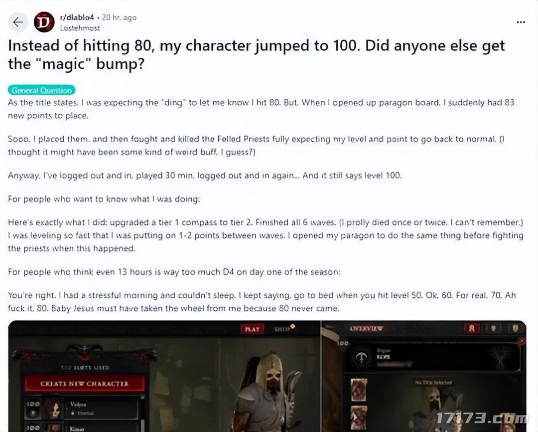 名爲“Lostehmost”的reddit用戶分享了他的經歷,當他發現這個BUG時還以爲自己看錯,但突然多出的83個技能點不會騙人。Lostehmost還多次嘗試退出重進遊戲,來確認自己的角色沒有問題。事實證明突然跳20級升級並非遊戲的顯示錯誤。