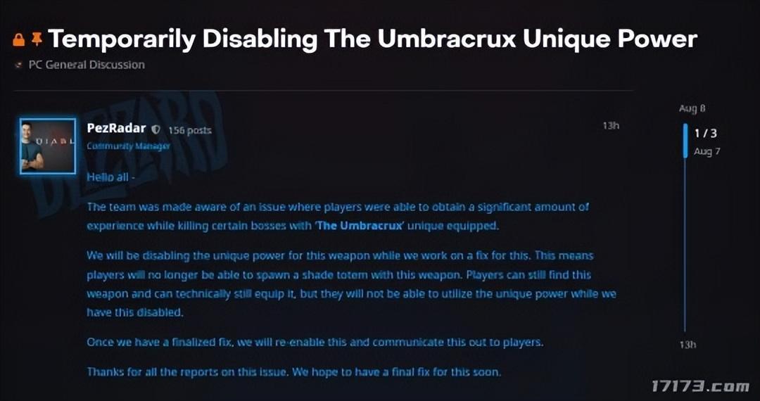 暴雪方面對於此事也反應迅速,官方論壇管理員PezRadar很快發文指出,這個經驗BUG是由於玩家角色使用的武器“晦暗核心”擊殺了特定BOSS所引起,因此官方目前已經禁用了該武器的特殊效果,直到BUG修復完成爲止。