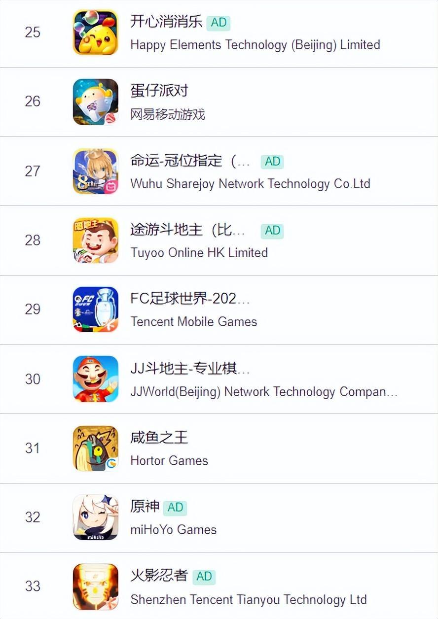 別看休閒遊戲體量不大,盈利能力還是相當不錯的,就拿該品類頭牌《開心消消樂》來說,遊戲至今仍穩定排在暢銷榜25位,位階高於蛋仔、FGO、原神和火影。