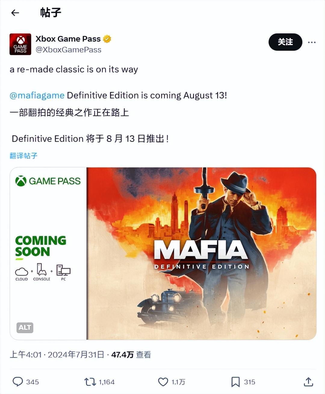 微軟 Xbox Game Pass 官方 X(推特)賬號發文宣佈,《四海兄弟:最終版》將於 8 月 13 日登陸 XGP 主機、PC、雲平臺。