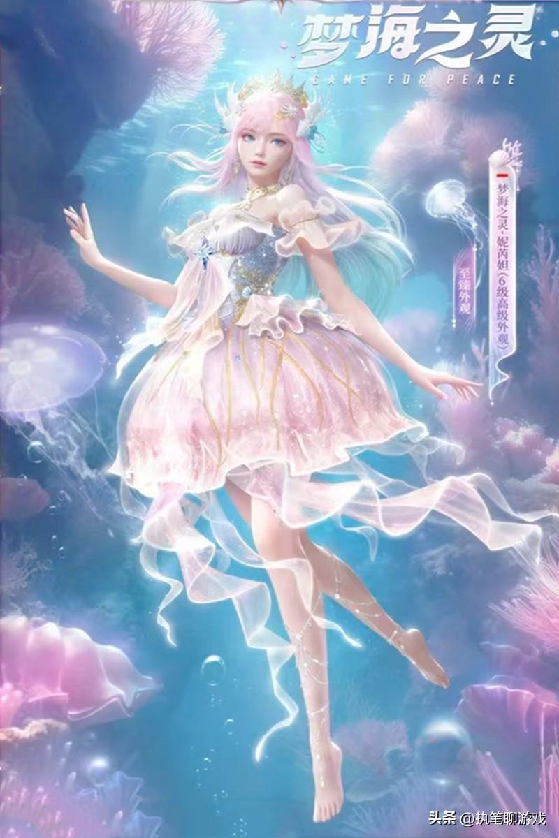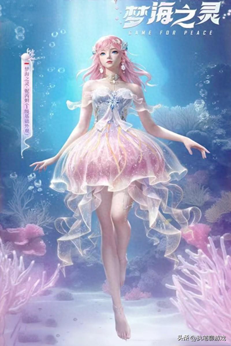 首先是1級基礎外觀,清爽簡約的粉色長髮,用貝殼作爲髮飾來進行點綴,彰顯海洋的浪漫與夢幻。以水母爲原型設計的獨特裙襬,夜晚的時候會出現六棟的光華特效。