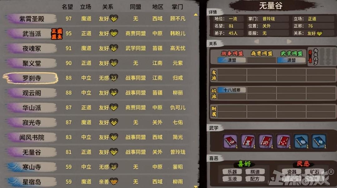 通過不斷髮展自身宗門,玩家總算可以硬氣起來去攻打別的較弱宗門了,攻打成功後可以將其變成附屬宗門,成爲附屬宗門之後會定期向你上繳貢品,最終把所有宗門收服從而成爲真正意義上的武林盟主算是遊戲的小目標了。