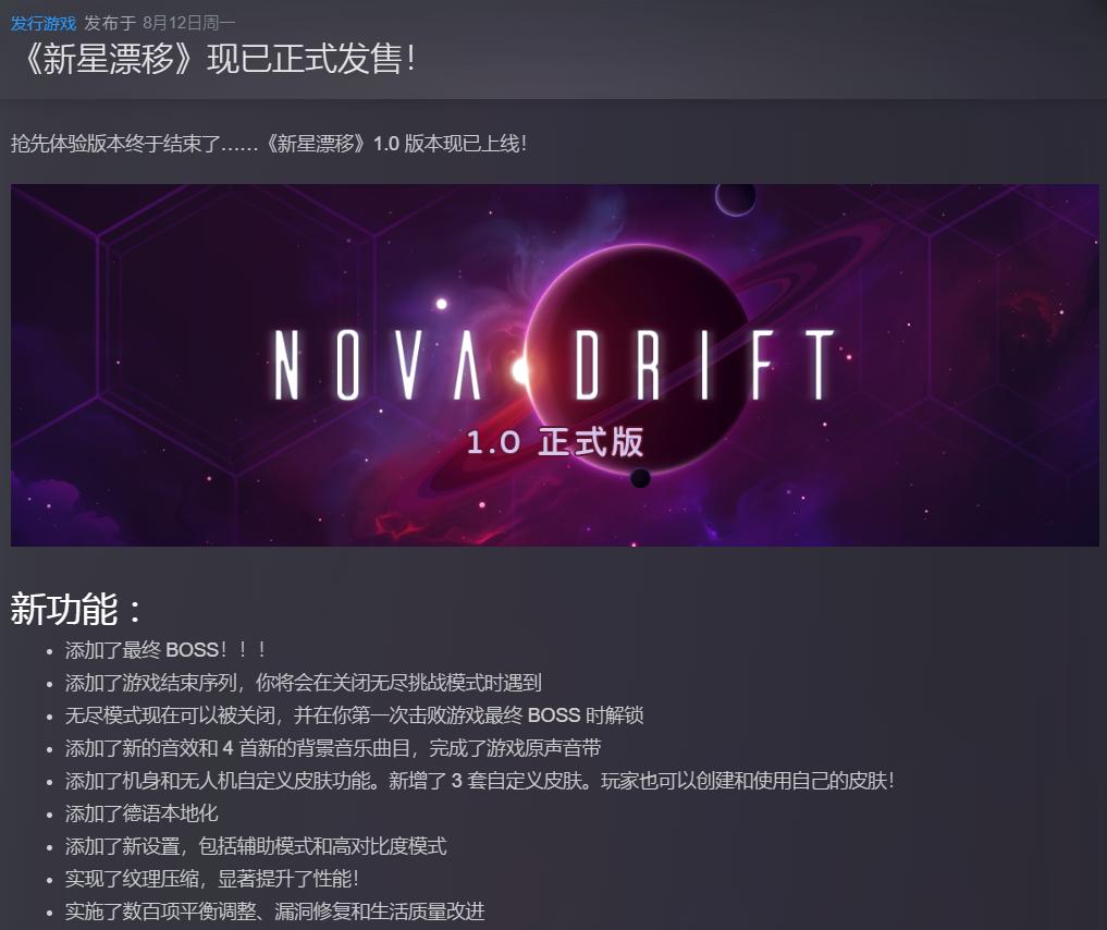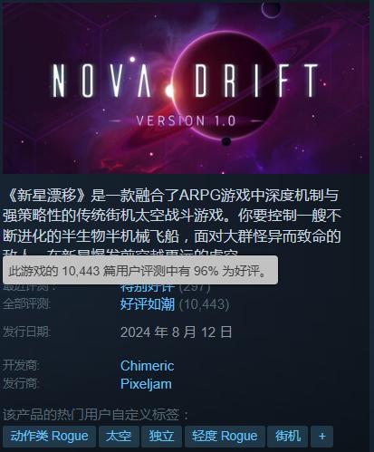 《新星漂移》是2019年3月登錄Steam的,一款以太空戰鬥爲題材的肉鴿遊戲。