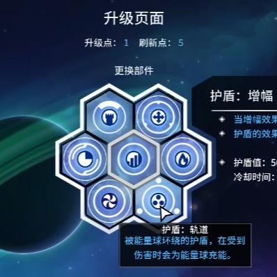 你可以選擇強化機體,強化武器,或者強化護盾,根據不同的選擇,飛船升級後的基礎流派也會有所不同。