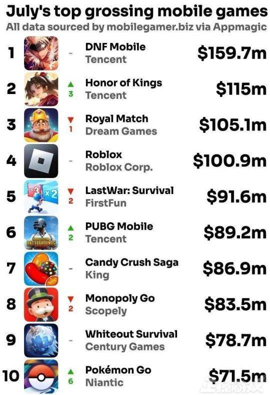 據Sensor Tower的數據,5月份《地下城與勇士:起源》的收入超過了《王者榮耀》與《和平精英》的總和,6、7月份DNF手遊更是連續兩個月位列全球手遊收入排名榜首。7月收入達到 1.597 億美元,比位列榜單第二、此前長期 " 霸榜 " 的 MOBA 手遊《王者榮耀》同期營收 ( 1.15 億美元 ) 多了接近 4500 萬美元,可以說目前DNF手遊已經基本復刻了當年《王者榮耀》的輝煌。