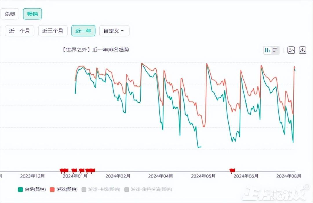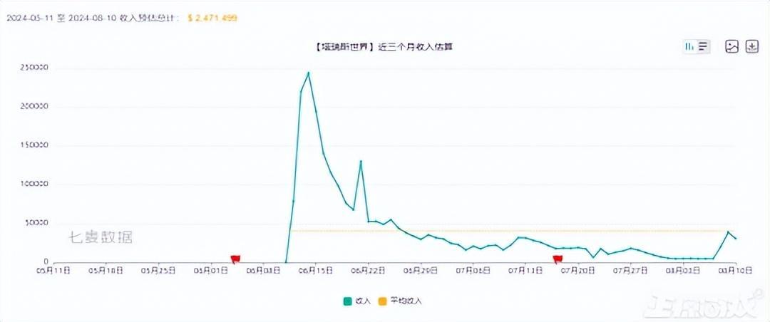 不過對比騰訊的《白荊迴廊》來說,《世界之外》在iOS端收入並沒有出現明顯下滑,反而是更新版本後就會有一波小上升,運營半年多iOS端總流水已經累計至2.81億元。機構預估7月iOS流水在3220萬以上,如果按照IOS和安卓1:2的比例計算,7月份《世界之外》的流水也有破億。