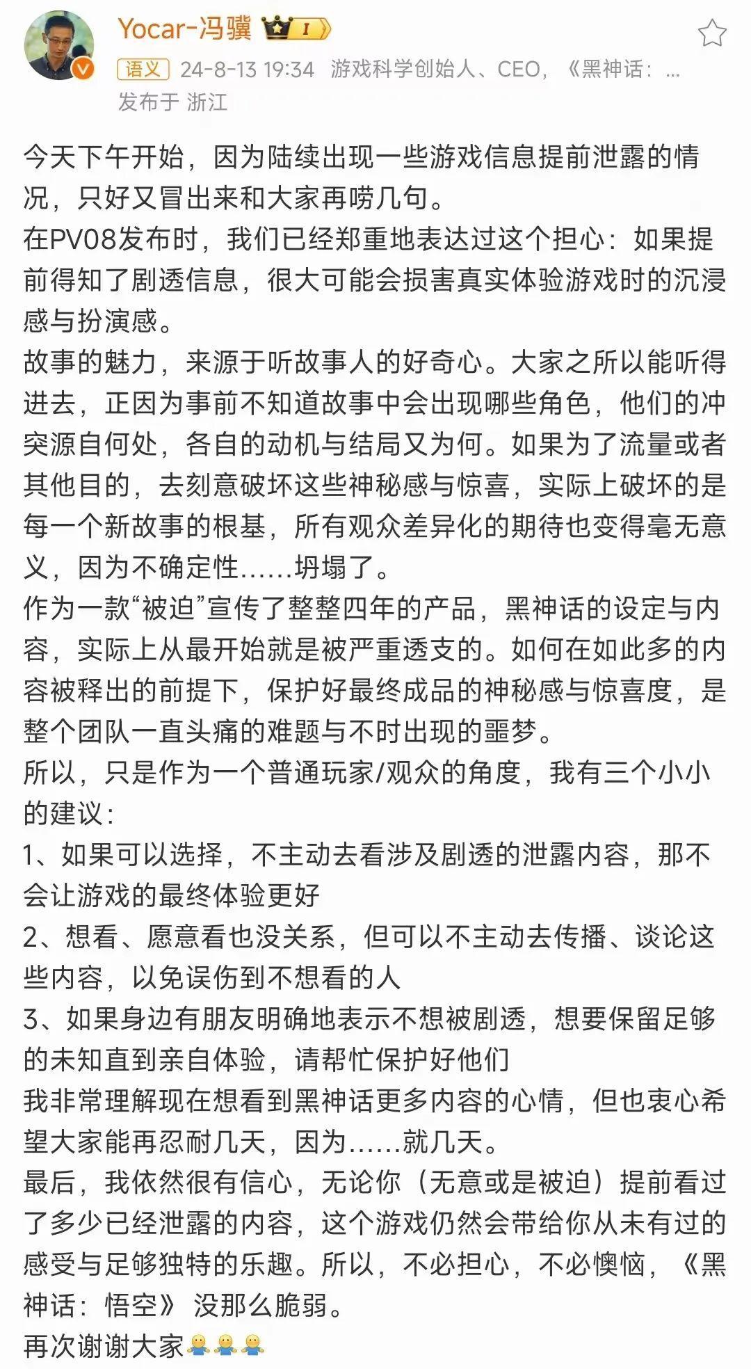 對此,《黑神話:悟空》製作人Yocar(馮驥)發文回應稱,他們先前就擔心過被提前泄露的情況,在此希望玩家再忍耐幾天。同時,他表示,自己對遊戲依然很有信心,認爲即使是在被泄露的情況下,《黑神話:悟空》仍能帶給玩家從未有過的樂趣。