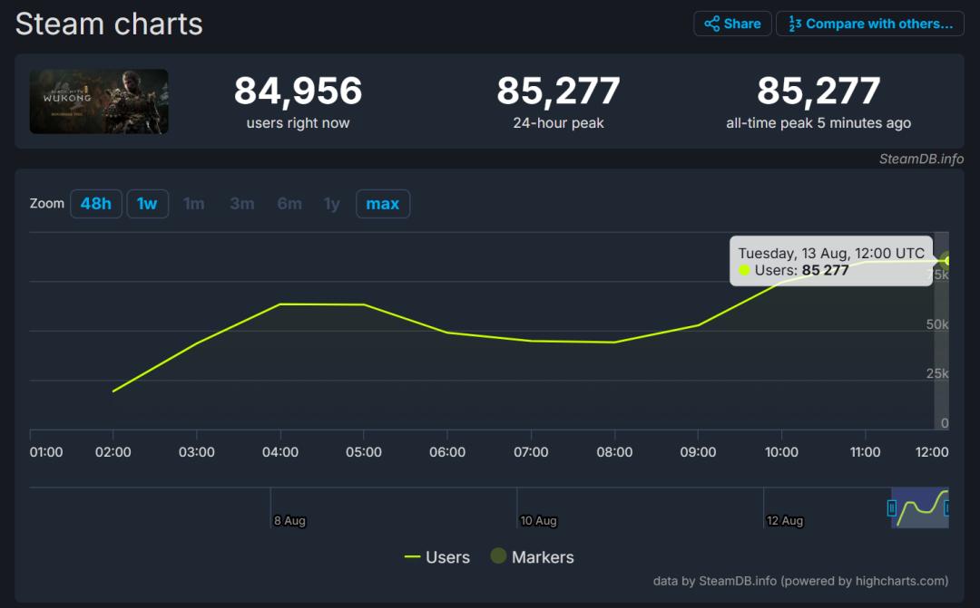 距離遊戲正式發售還有7天,但顯然,很多人已迫不及待——僅僅是一個測試硬件性能的工具,同時在線人數都能超過8萬,而且就趨勢來看,或許人數還會繼續上漲。