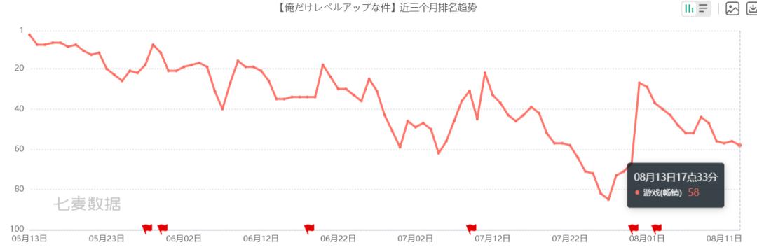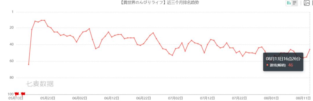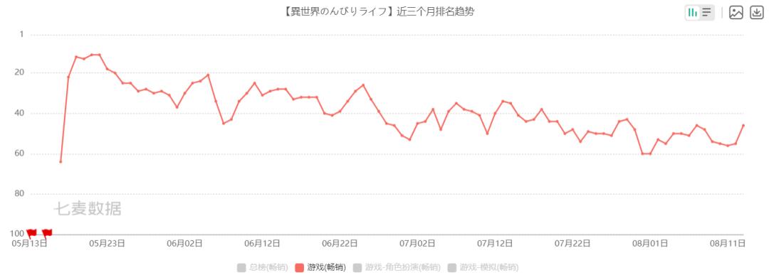 而《異世界慢生活》的高光時刻還是在日本市場。今年5月下旬,這款遊戲在日本市場上線,此後快速拿下App Store暢銷榜11位的成績,在上線熱度褪去後,遊戲依然穩定在暢銷榜50~60位的區間,並且沒有出現大幅波動的走勢。