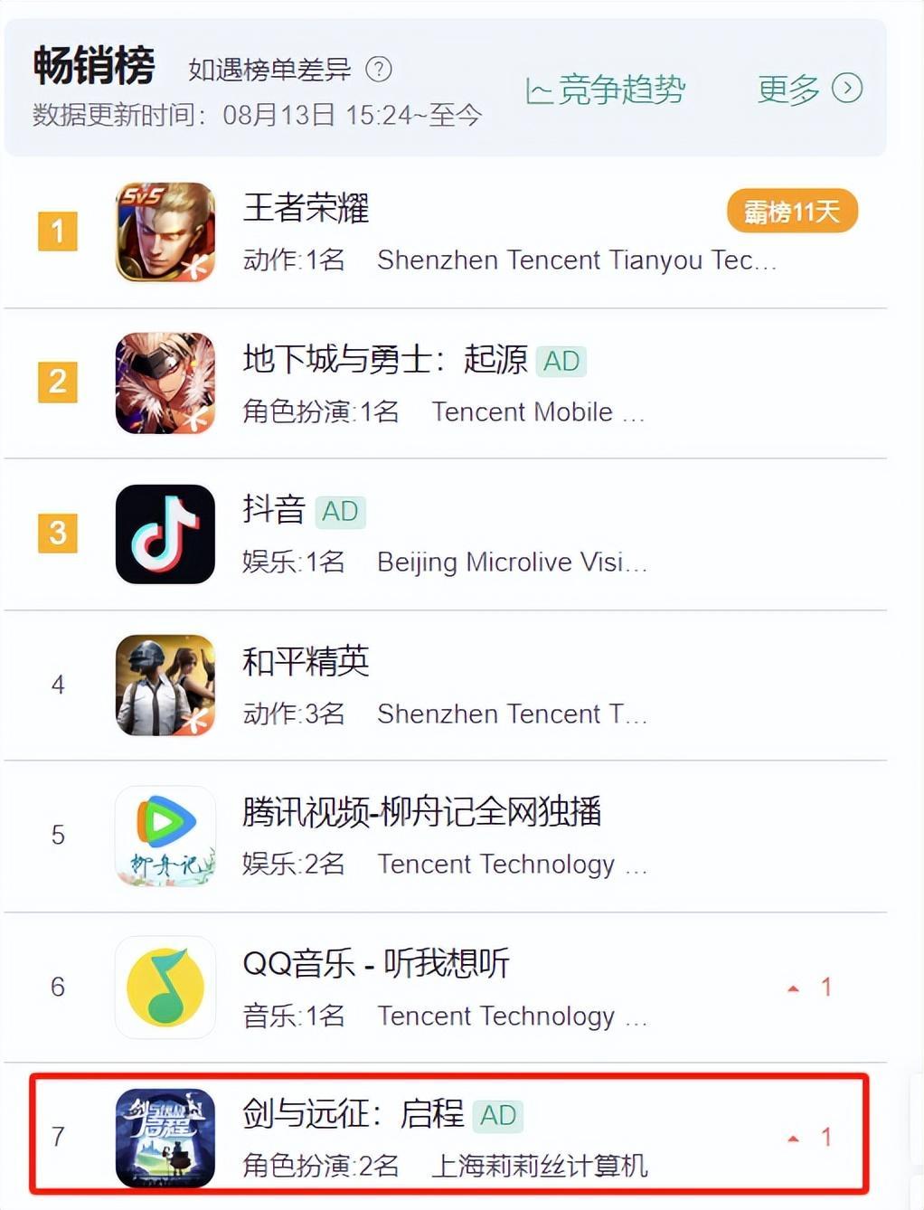 目前,在暢銷榜上,《劍與遠征:啓程》僅處於第七名的位置。就這,還是在廠商大量採買廣告才爭取來的熱度。