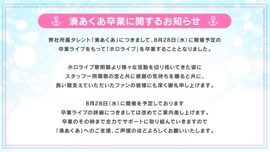 然後就到了2024年8月6號,hololive官方宣佈了湊阿庫婭的畢業公告。
