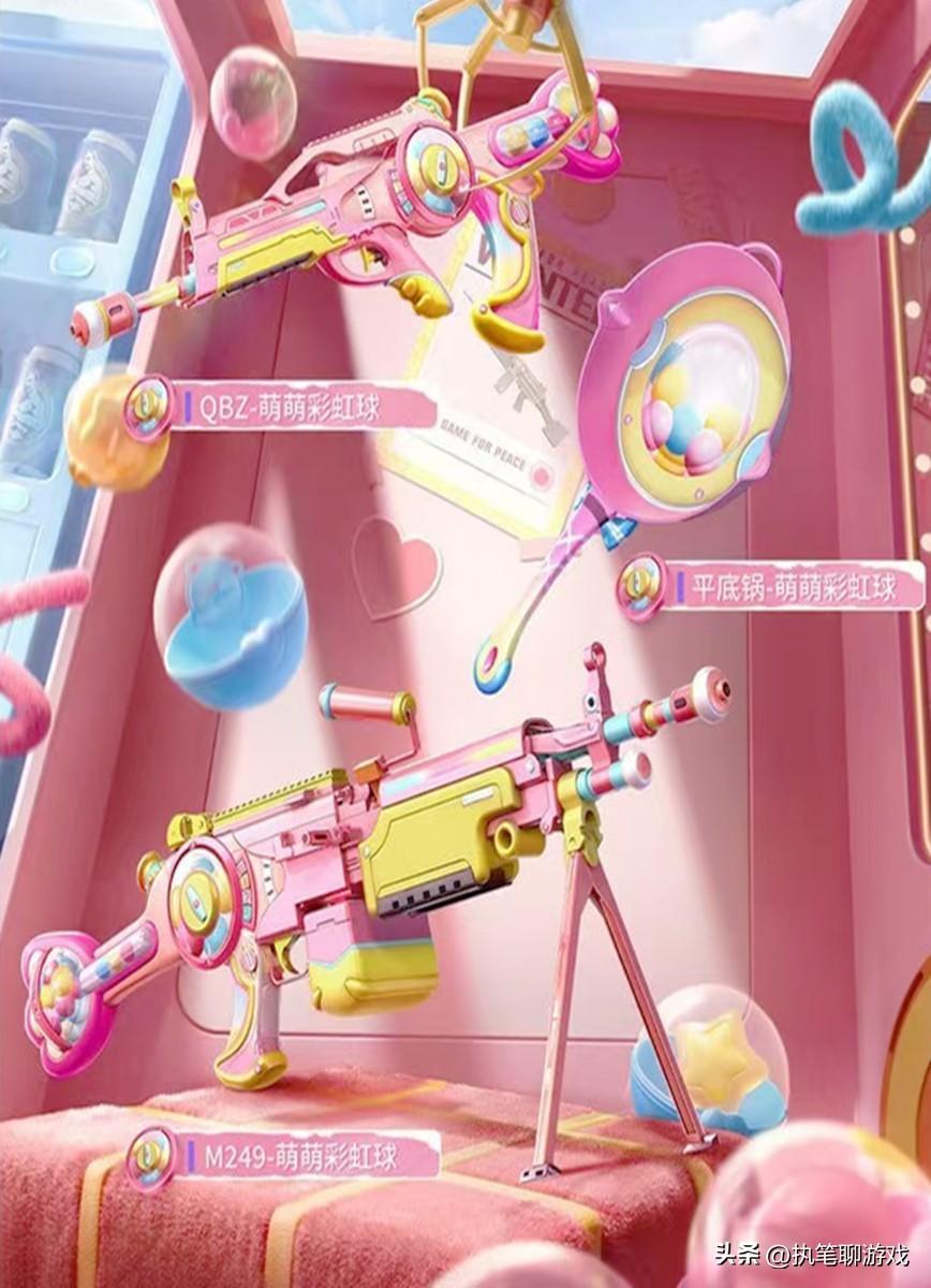 首先是3個槍皮,它們分別是QBZ、平底鍋、M249,被光子重新建模後以粉色爲主、黃色爲輔,再加上藍色作爲點綴,整體看起來還是挺可愛的。