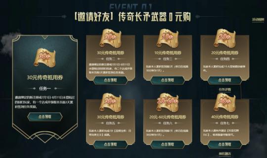 爲了相應這部玩家的訴求,《激戰2》特意搞了一個傳奇長矛零元購的活動,玩家只需要邀請新註冊或退遊超1個月的老玩家的迴歸做一些日常任務,即可獲得10到60元不等的抵用券,最低0元購得價值180元的傳奇長矛。
