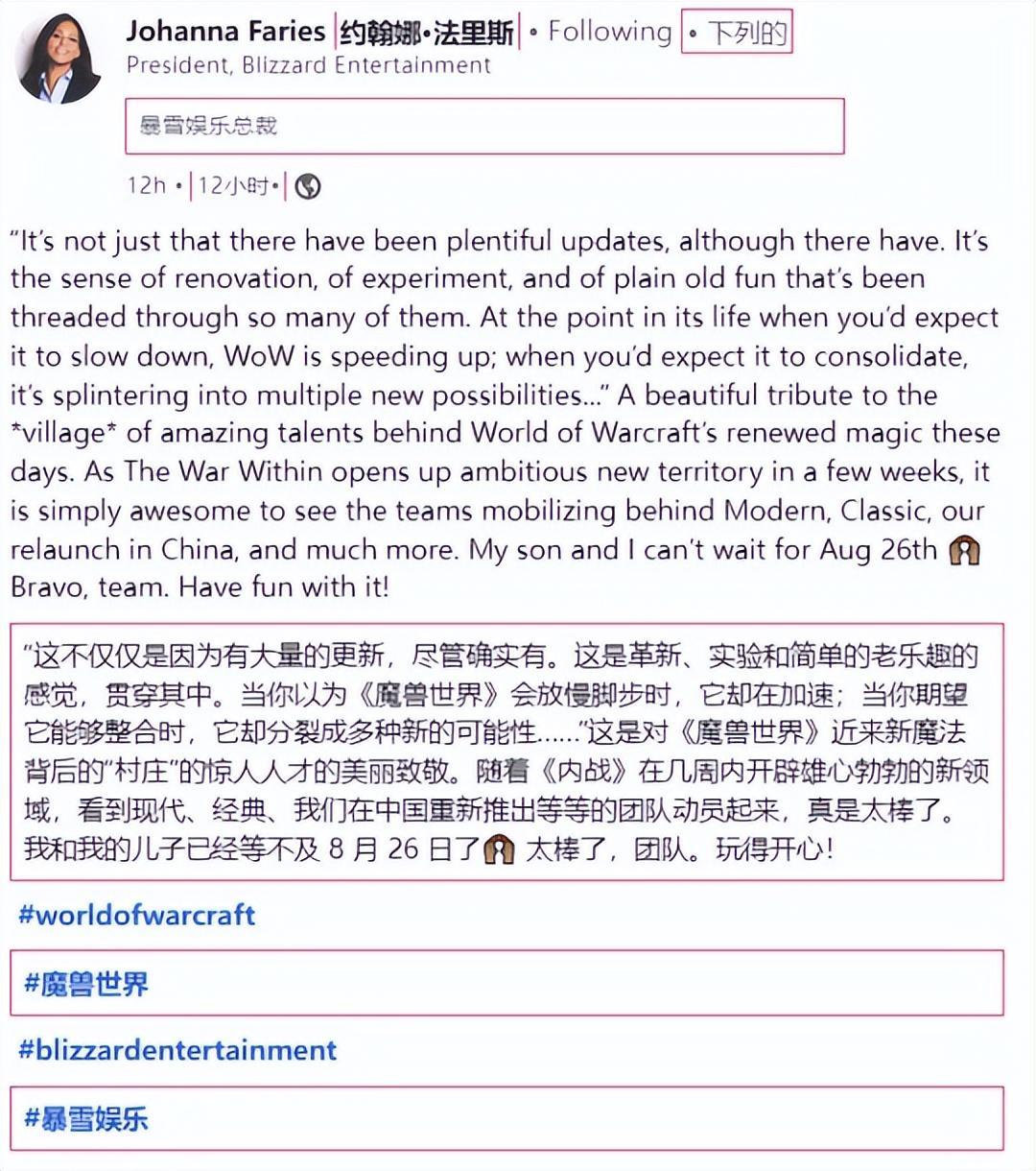 或許是因爲《魔獸世界》國服迴歸後,給暴雪帶來了一筆巨大的收益。近日,暴雪總裁 Johanna Faries公開盛讚項目組所取得的成就,表揚開發團隊齊心協力爲正式服,懷舊服以及國服重啓和更多項目而付出的努力。