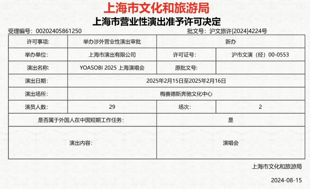 YOASOBI 將於 2025年2月15日-16日 在上海梅賽德斯奔馳文化中心舉辦。