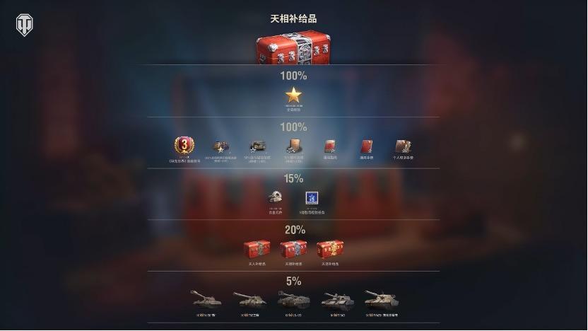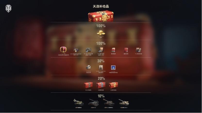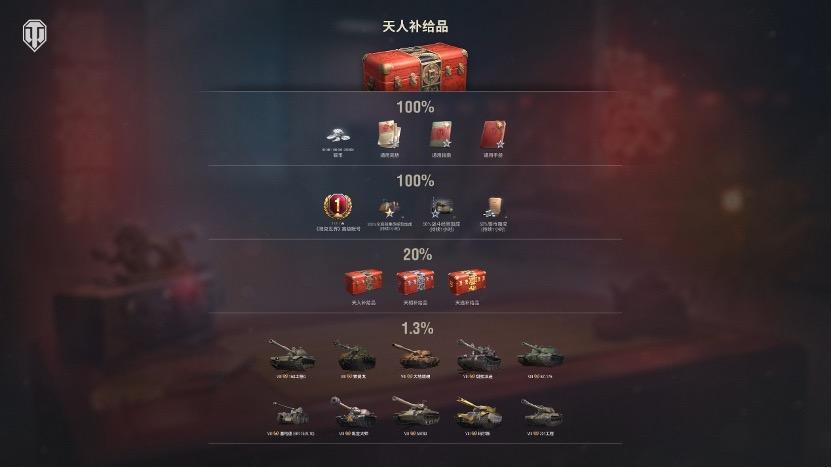 購買內含5倍勝場經驗任務和金幣的禮包,即可獲得附贈的天人補給品。每個天人補給品均有機會掉落VIII級坦克,甚至還有機會掉落更多補給品獎勵。補給品獎勵可能是另外一個天人補給品、內含IX級坦克的天相補給品,甚至還可能是內含極其稀有X級坦克的天選補給品。而這些補給品甚至還有機會掉落更多其他補給品。