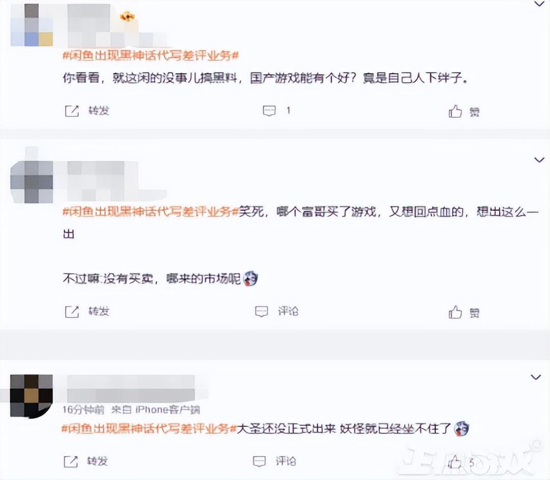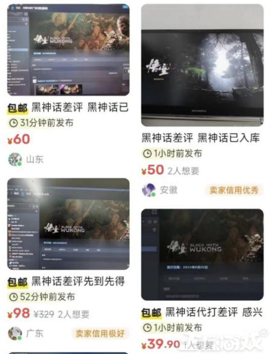 在7月,因爲部分女拳人士對《黑神話:悟空》的重拳出擊,在某二手平臺上曾興起過一陣子的“黑神話代寫差評”業務,售價從30元到268元不等,絕大部分都是喫瓜網友的釣魚交易帖。