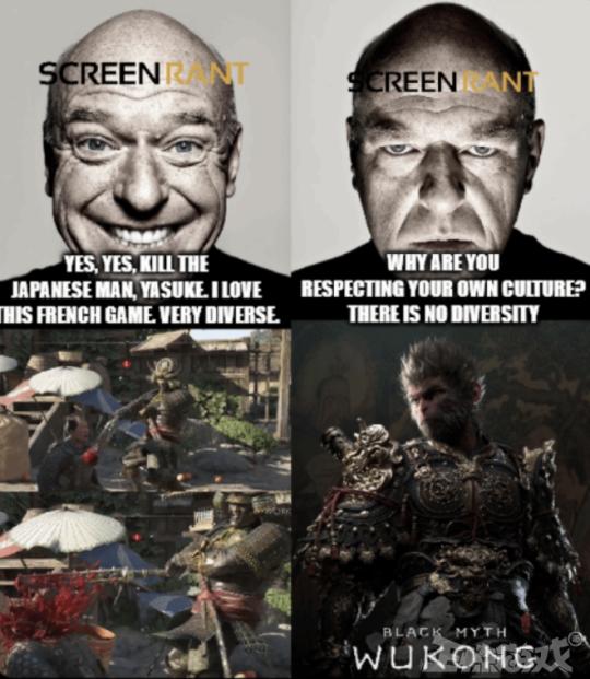 順帶一提,別說是中國玩家,就連一些外國網友都覺得這些評測機構不靠譜,不專業,有人特意做了一個《刺客信條:影》黑人主角VS《黑神話:悟空》猴子的梗圖,來調侃這幫子評測機構、遊戲廠商爲了追求多元化去篡改歷史。