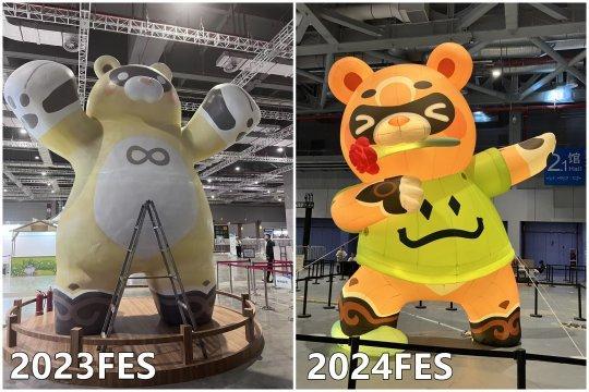 入目就是一個碩大的鍋巴氣球人,穿着去年FES完成委託就能獲得的同款蘭那羅T恤,讓我多少有點嘉年華精神延續的觸動。叼着玫瑰擺着騷氣動作的它,也成爲每個踏入2館的玩家,必須打卡合影的地標。