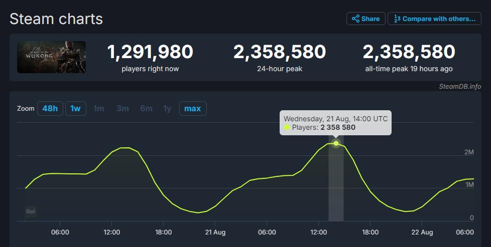 先來看些好消息。昨天晚上,《黑神話:悟空》Steam在線人數達到了235.8萬人,刷新了自己發售首日創下的買斷制單機遊戲在線人數記錄。