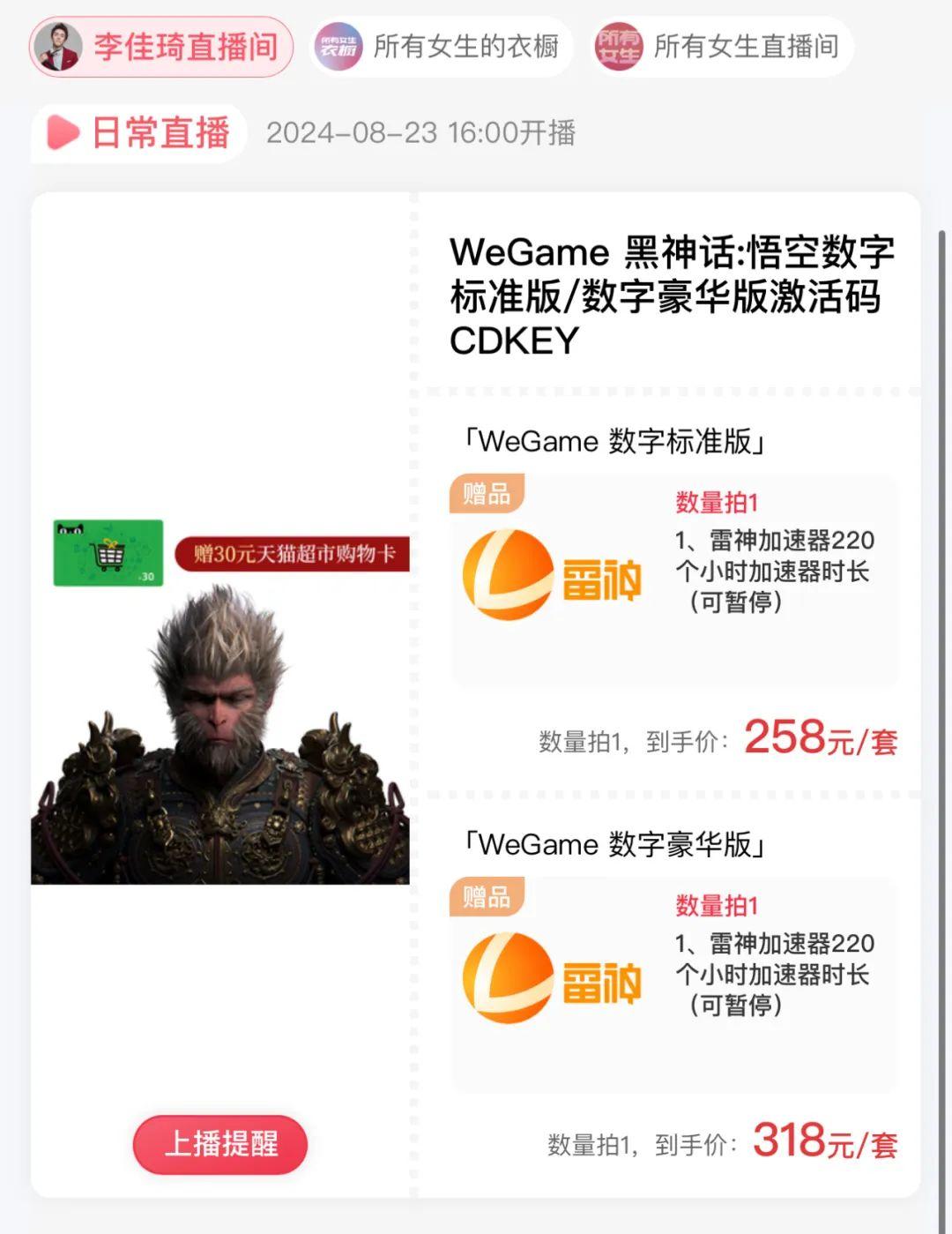 然後就是,李佳琦將於明天下午在某寶直播間賣WeGame版《黑神話:悟空》,比遊戲原價便宜10元,送30塊錢天貓超市購物卡與220小時遊戲加速器卡。