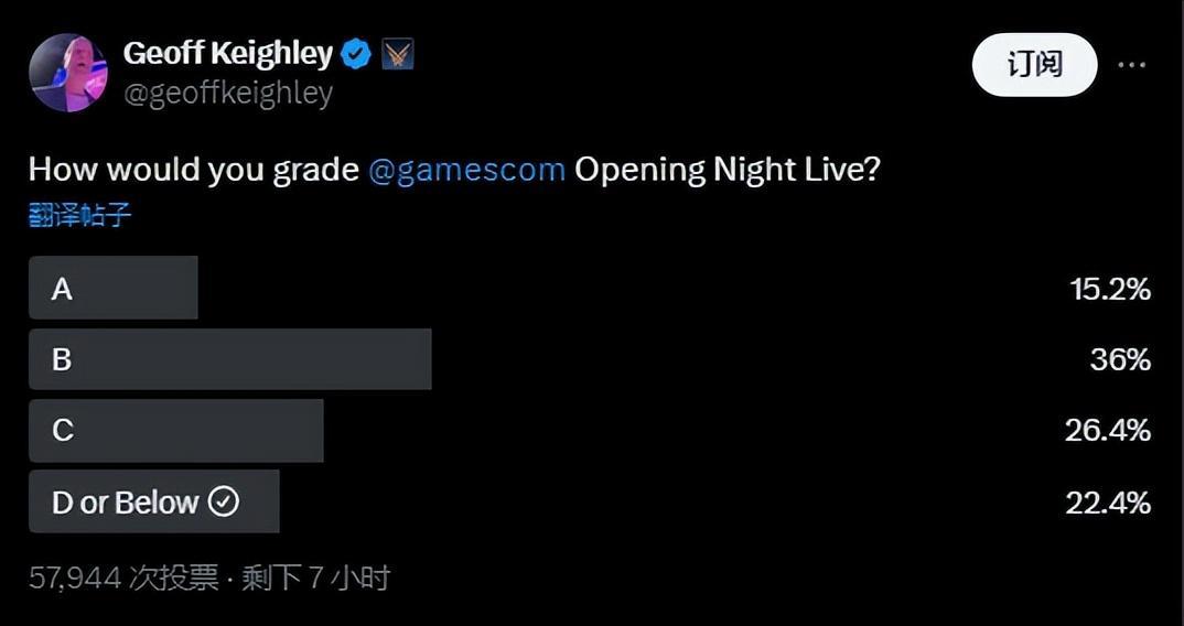 主持人Geoff Keighley在節目結束後發起投票調查觀衆們對本次展會的滿意度,截至發稿,已有57944人蔘與投票,A級投票佔比僅15.2%,B級36%,C級26.4%,D級或更低佔比22.4%。