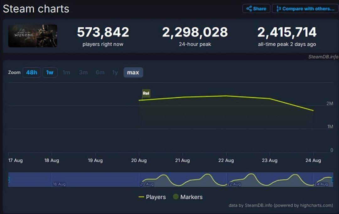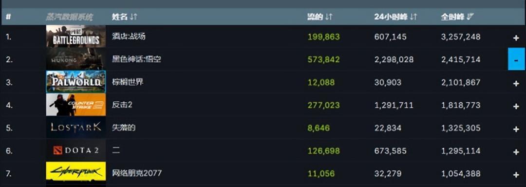 現如今,《黑神話:悟空》在Steam平臺享有96%的特別好評,Steam同時在線峯值達到了可怕的240萬+,位列歷史峯值磅第二位,僅次於當年全球爆火的喫雞PUBG。