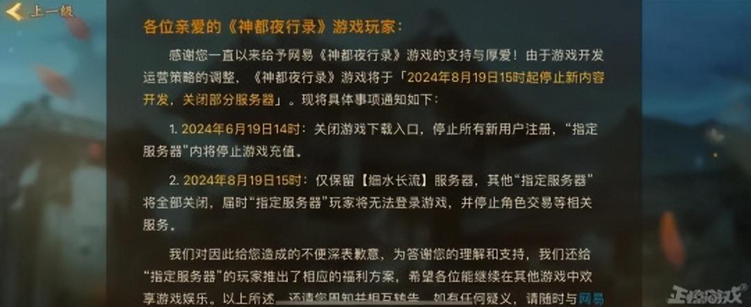 網易旗下的3D卡牌遊戲《神都夜行錄》,在6月19日就關閉下載和註冊,近日正式宣佈“停運”,遊戲將於2024年8月19日不再更新內容,遊戲只保留一個“細水長流”服務器。《神都夜行錄》玩家可在《夢幻西遊》手遊、《大話西遊》手遊及《亂鬥西遊2》遊戲中領取成長大禮包。