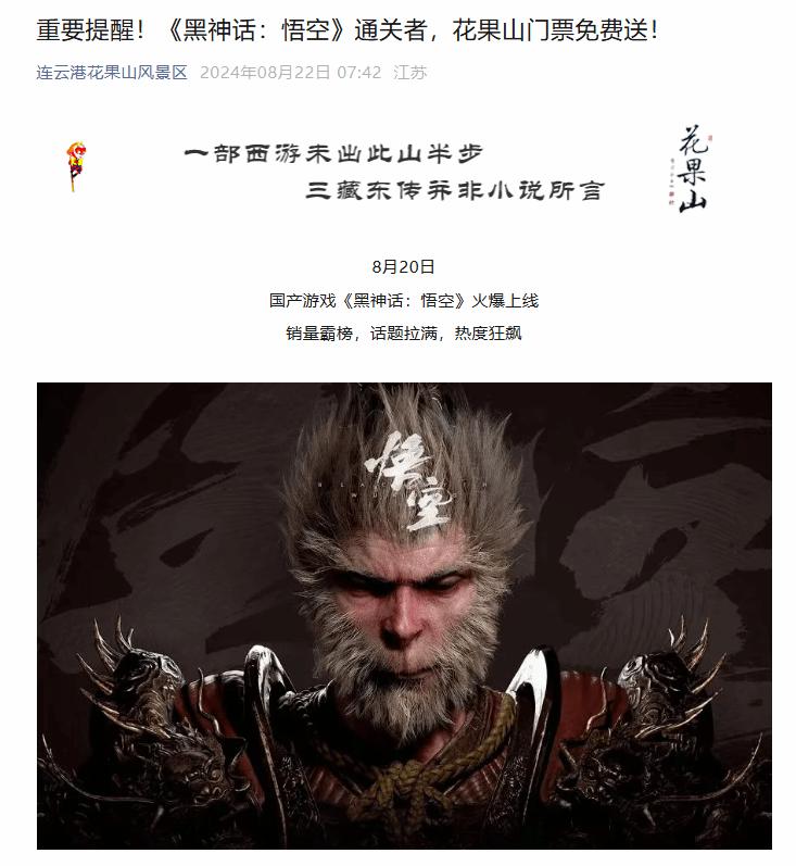 剛剛過去的這一週,你能看到全國多家文化旅遊單位,近乎在瘋搶《黑神話》的流量,恭迎各位天命人前往景區旅遊。尤其是孫悟空的老家連雲港花果山,和遊戲中取景最多的山西省可謂贏麻了。隰縣小西天景區旅遊接待工作人員稱,從遊戲取景地被公佈後,該景區8月20日售出的門票比去年8月20日增長300%,客流量已經超過了接待能力。