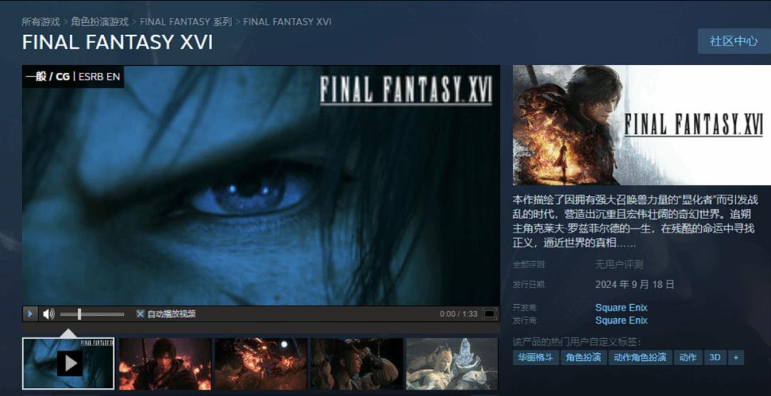 《最終幻想16》PC版9月17日發售。玩家已經可以訪問遊戲的Steam或者Epic Games頁面,下載試玩遊戲DEMO。PC版《最終幻想 16》遊戲目前有標準版(298 元)和完全版(398 元)兩個版本,完全版除了遊戲本體之外,還包括第一波DLC Echoes of the Fallen(天空餘音)和第二波DLC The Rising Tide(滄海慟哭)的內容。