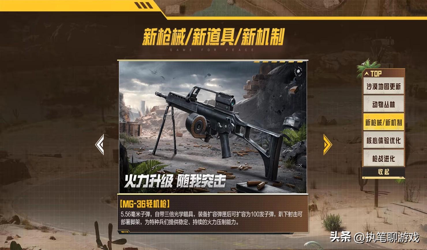 首先是火力升級的MG36輕機槍,作爲5.56mm家族的一位新成員,自帶3倍鏡,擴容之後可以攜帶100發子彈,趴下後會自動打開腳架,足以與“大盤雞”媲美,甚至有過之而無不及!