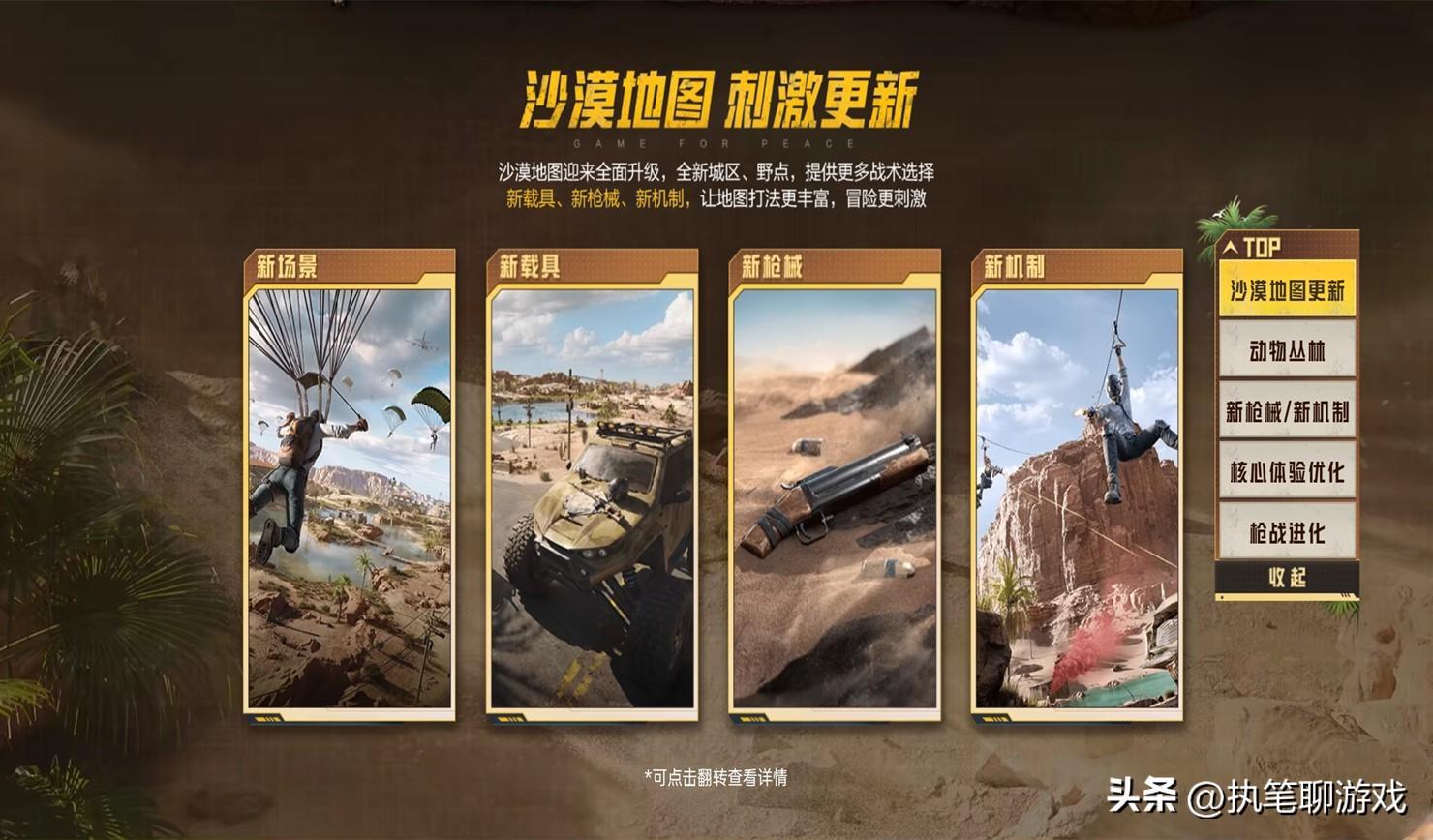 至於沙漠3.0新地圖,雖然不是主角,但是更新力度也是極大,不僅新增集市、度假村、卡車站、綠洲多個新場景,而且還帶來了新載具沙漠越野車、新武器M79短管榴彈槍以及滑索、木樁、鉤鎖等新機制,全新的地圖也必將給沙漠賦予不同以往的遊戲體驗。