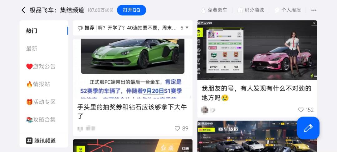 第一是其人羣基礎相當龐大。這不僅削弱了對入駐廠商的限制,使得大部分品類遊戲都能在此找到受衆,結合細分的圈子頻道,也使玩家之間更容易找到同好,形成找搭子、暢聊的熱鬧氛圍。這大概也解釋了,爲何騰訊會在今年Q2財報裏,把頻道定義成“讓熱愛找到組織,幫助用戶發現同好,交流共同話題、興趣等的主要社區”。