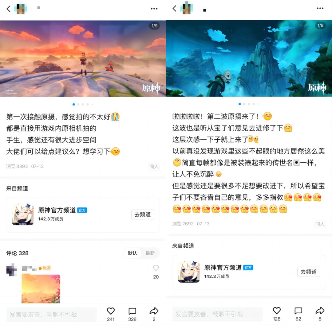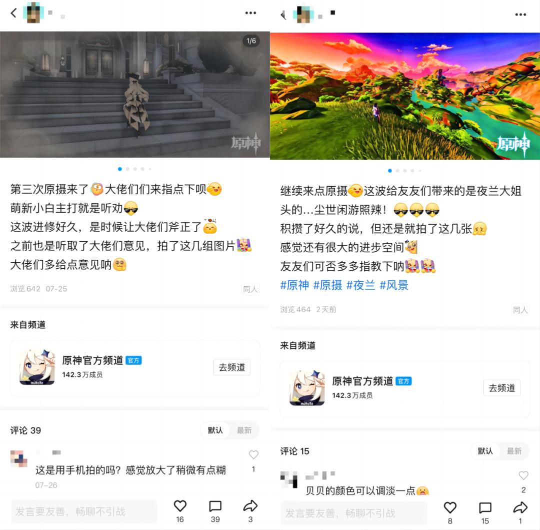 不論玩家的興趣有多小衆,在遊戲裏的關注點有多偏門,基本都可以在這裏找到志同道合的頻道。拿《原神》來說,從cosplay、表情包,到原攝(在《原神》裏專注攝影)、原壺(塵歌壺是《原神》中的道具之一,爲玩家開啓壺中洞天,玩家可在此進行UGC創作搭建)……玩家需求越豐富、越具體,騰訊頻道也就越多、越細緻。
