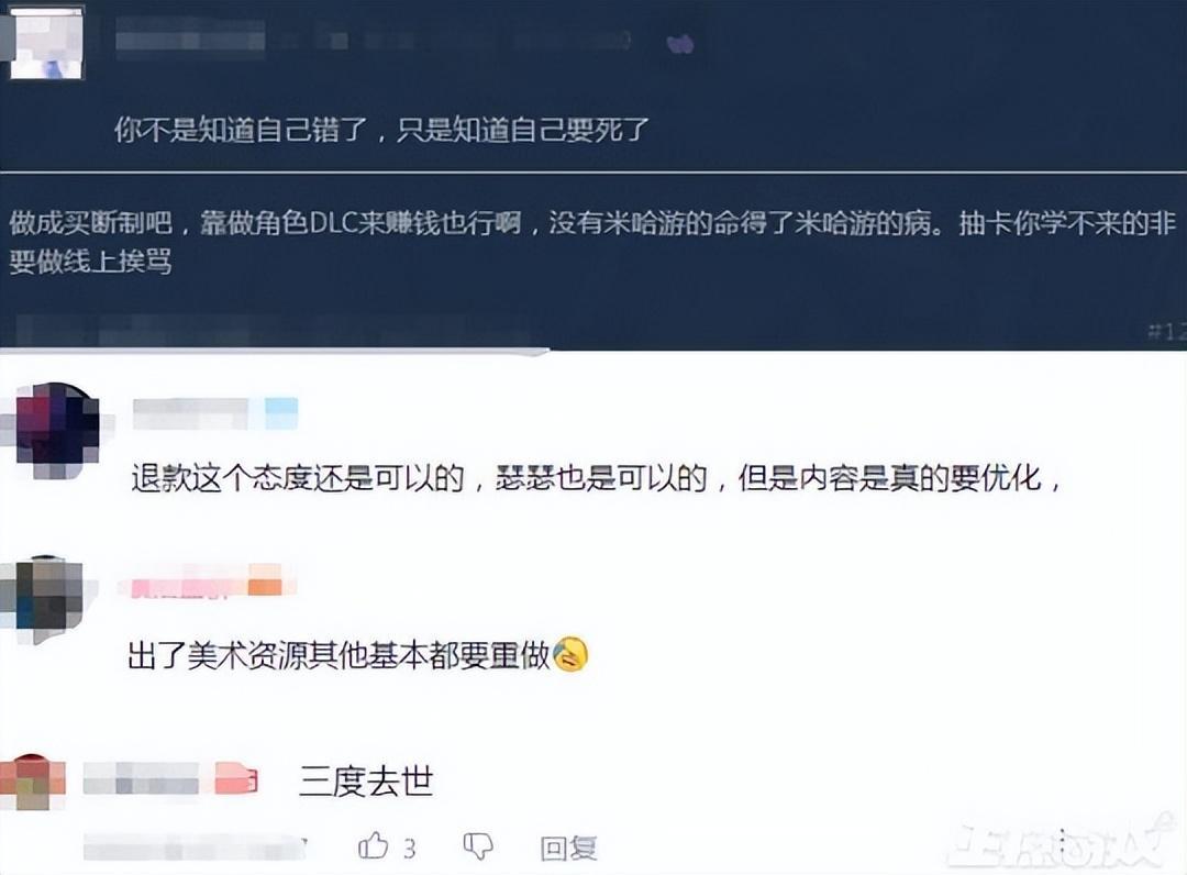 對此有網友表示,你不是知道自己錯了,只是知道自己要死了。還有網友建議,做成買斷制吧,靠做角色DLC來賺錢也行啊,沒有米哈遊的命得了米哈遊的病。還有網友表示,退款這個態度還是可以的,瑟瑟也是可以的,但是內容是真的要優化。也有網友直言,除了美術資源其他基本都要重做。