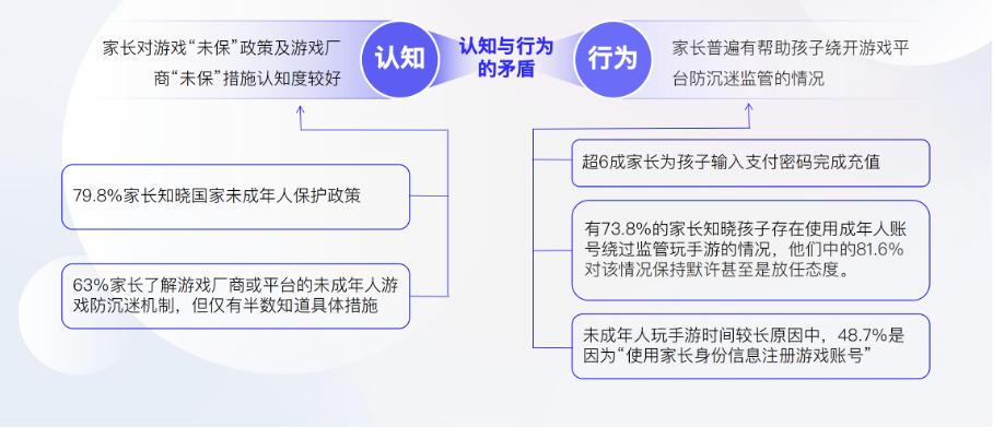 然而《報告》調查結果卻顯示,830新規推出後,相比政府和遊戲廠商的行動,部分家長對“未保”政策從責任到認知再到落實尚有距離,部分家長未能利用好平臺工具,默許甚至幫助孩子繞開平臺防沉迷監管。