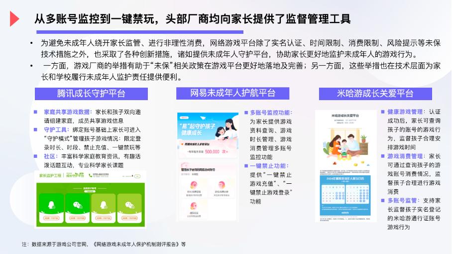 同時,從多賬號監控到一鍵禁玩,頭部廠商均向家長提供了監督管理工具。